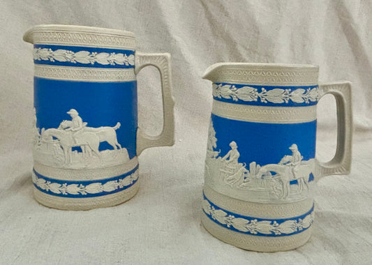 Pair of Late 19th Century Copeland Spode Jasperware Blue Fox Hunt Jugs