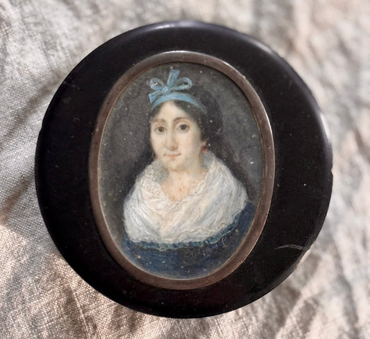 19th Century Papier-mâché Snuff Box with a Beautiful Watercolor Portrait Under Glass
