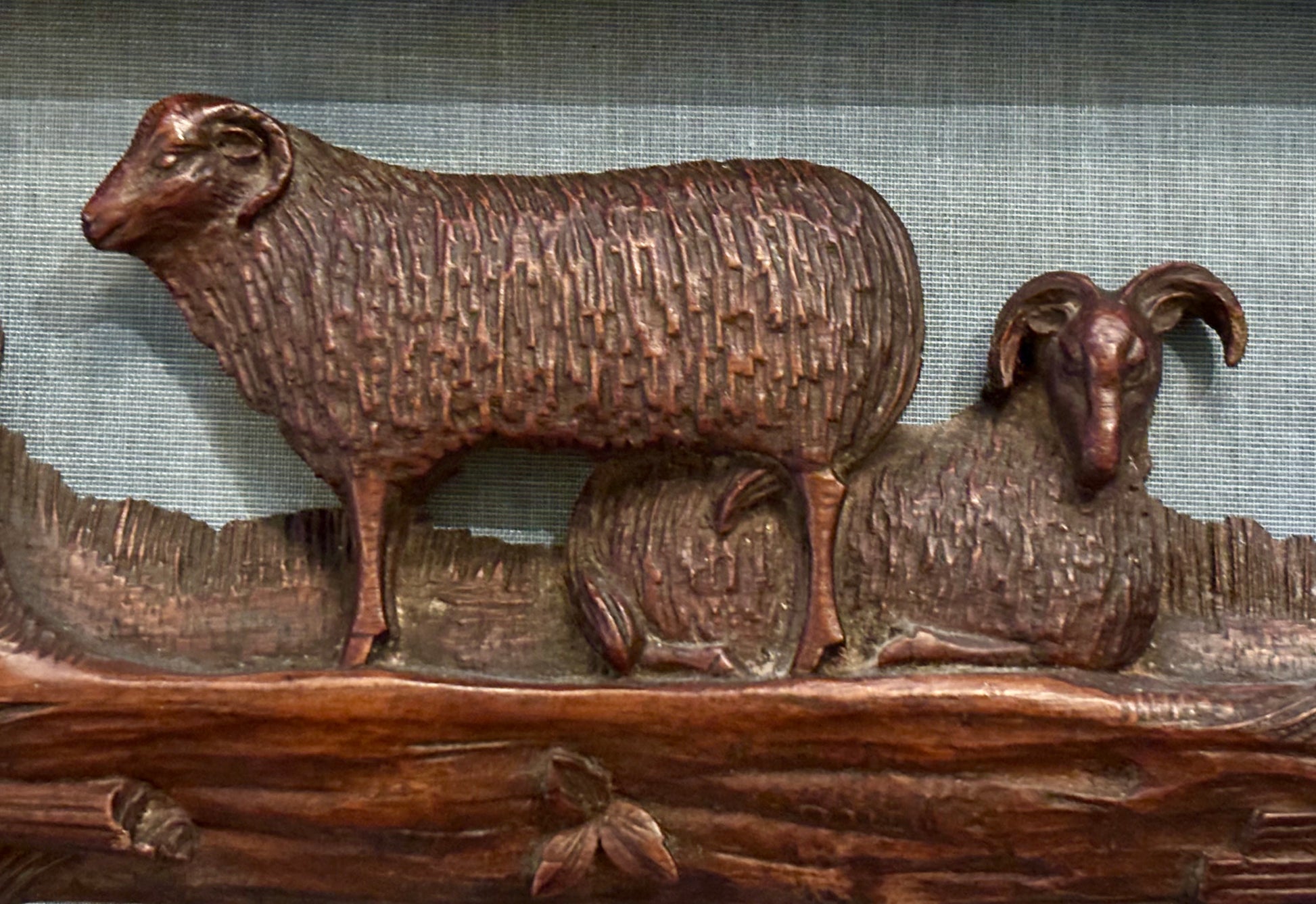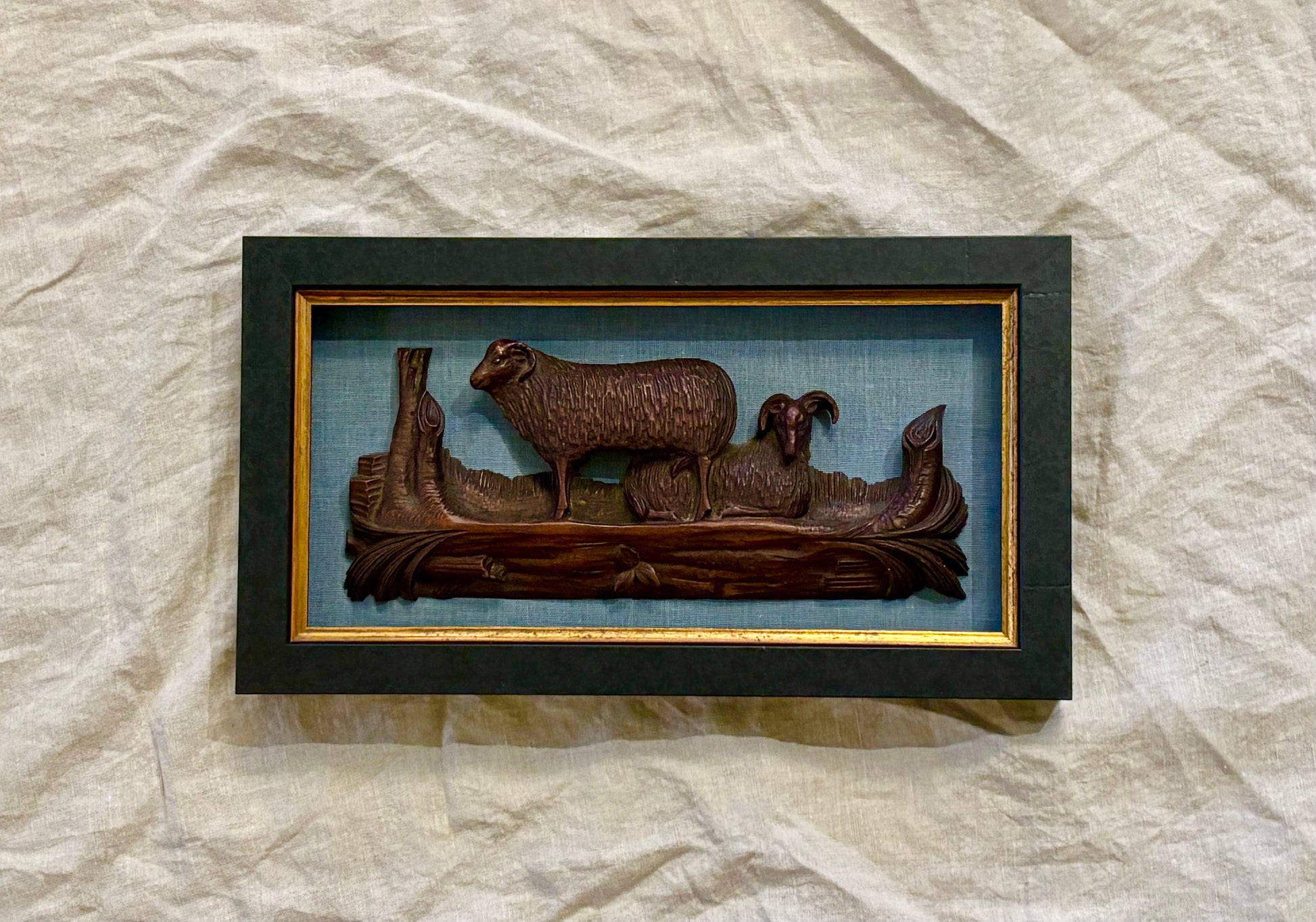 Hand carved wooden plaque featuring two rams in a field of grain. Newly mounted on blue silk in a shadowbox frame with a gold filet.