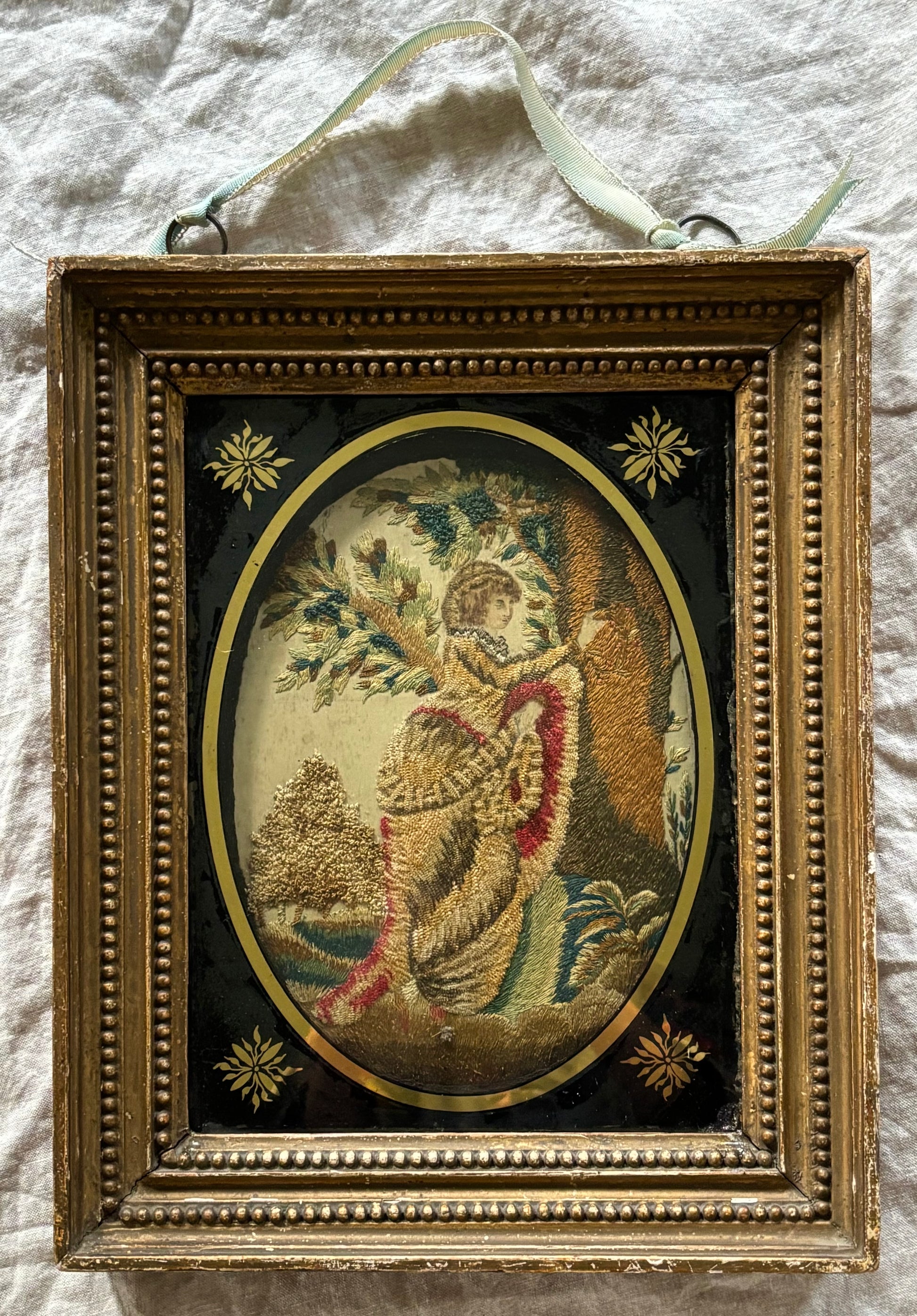 Exquisite 19th Century silk and chenille on silk embroidery depicting a young gentlewoman. Vibrant colors. In original frame.