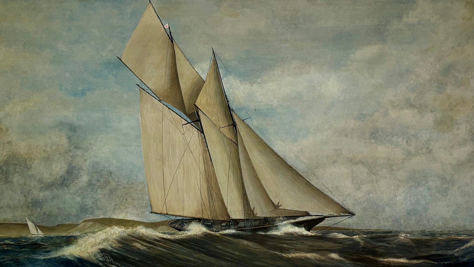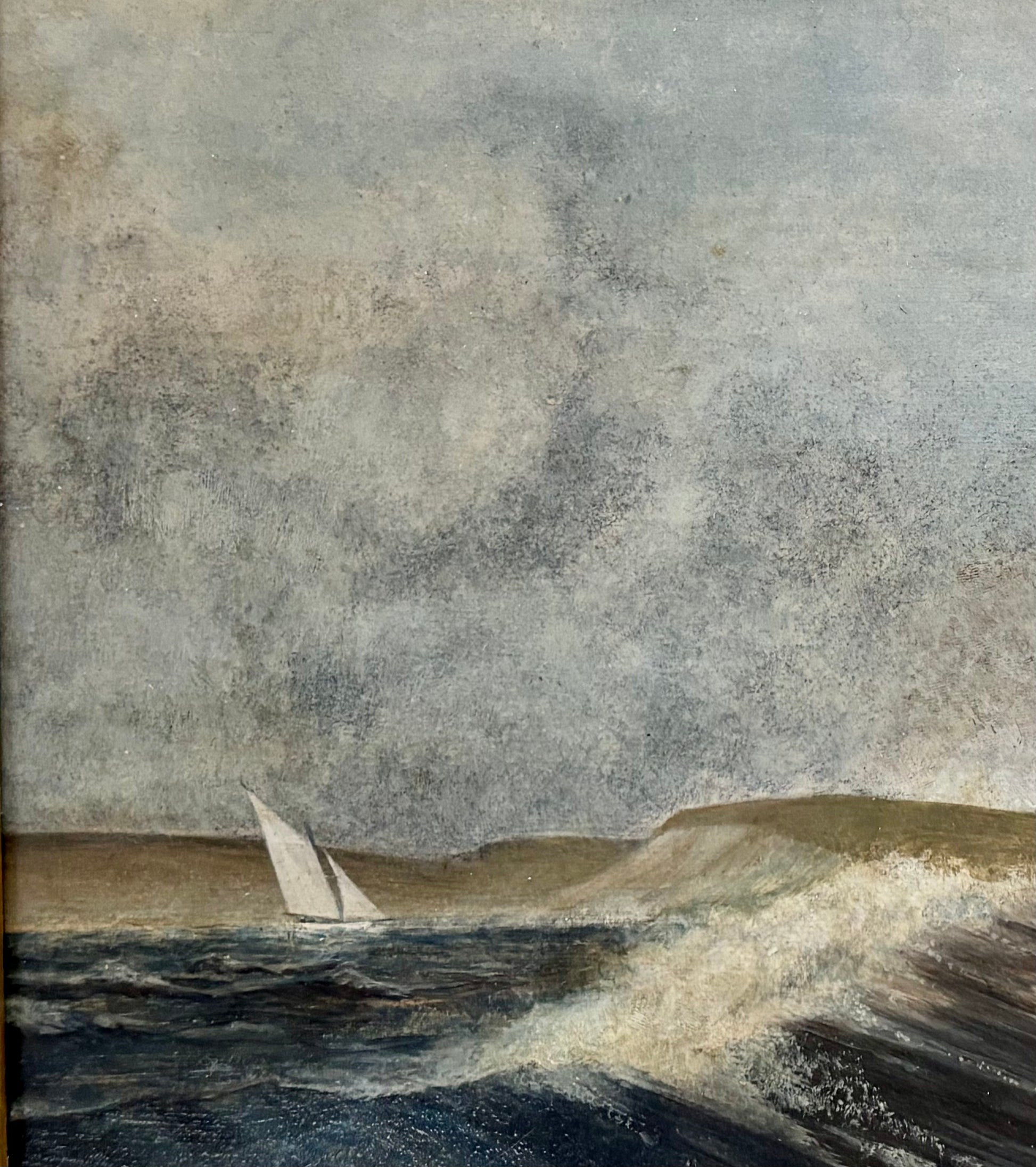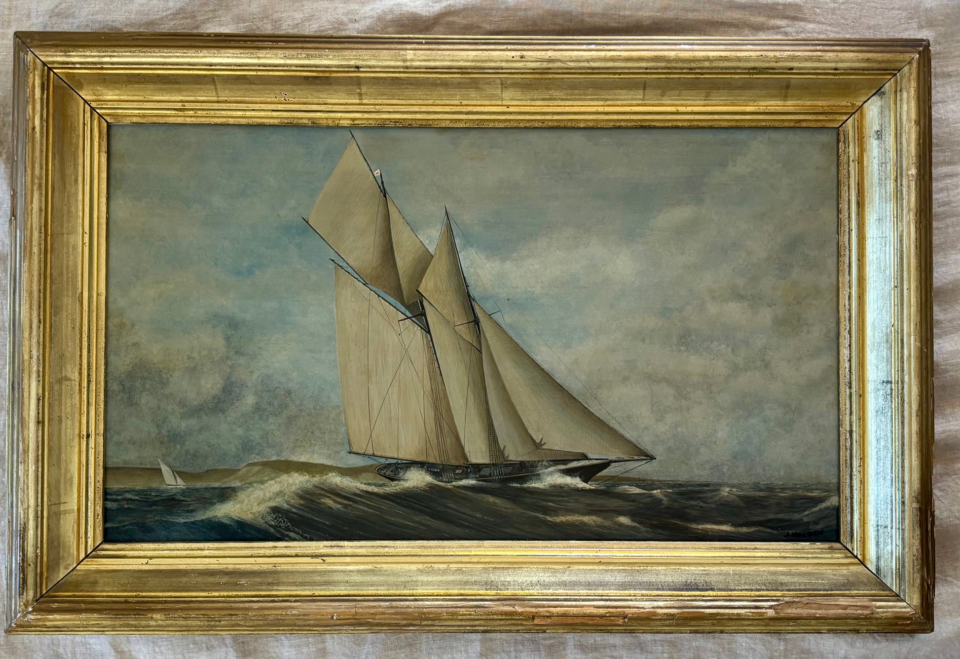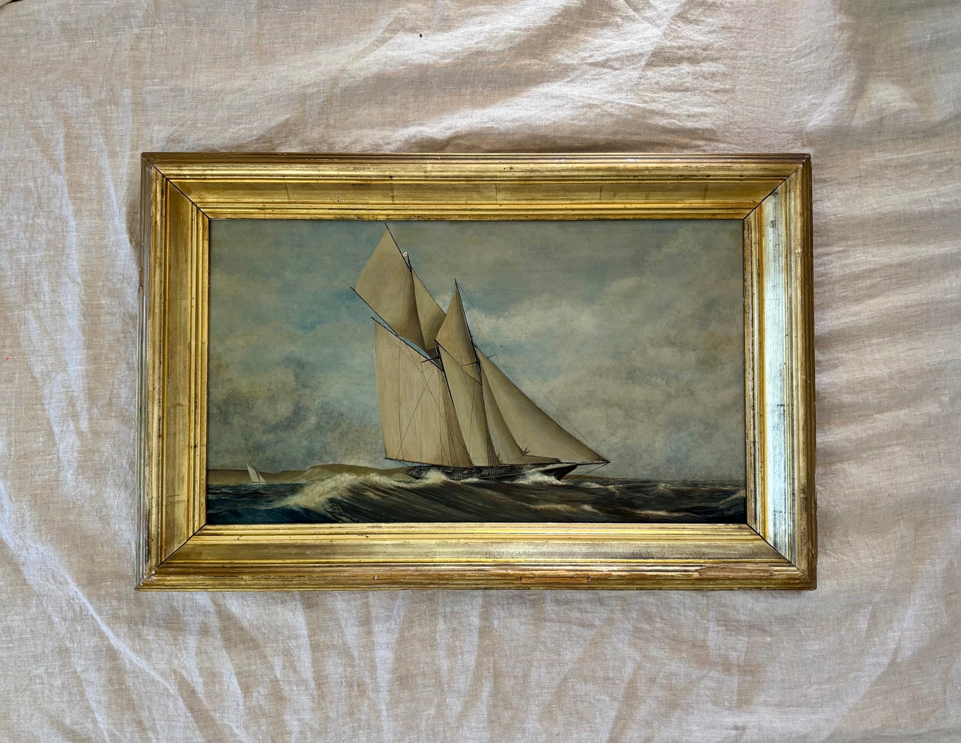Late 19th or early 20th century seascape featuring a sailing vessel and seascape. Recently cleaned. In original lemon gold frame. Artist’s name is somewhat obscured, but appears to be J. Holden. Some retouching to frame.