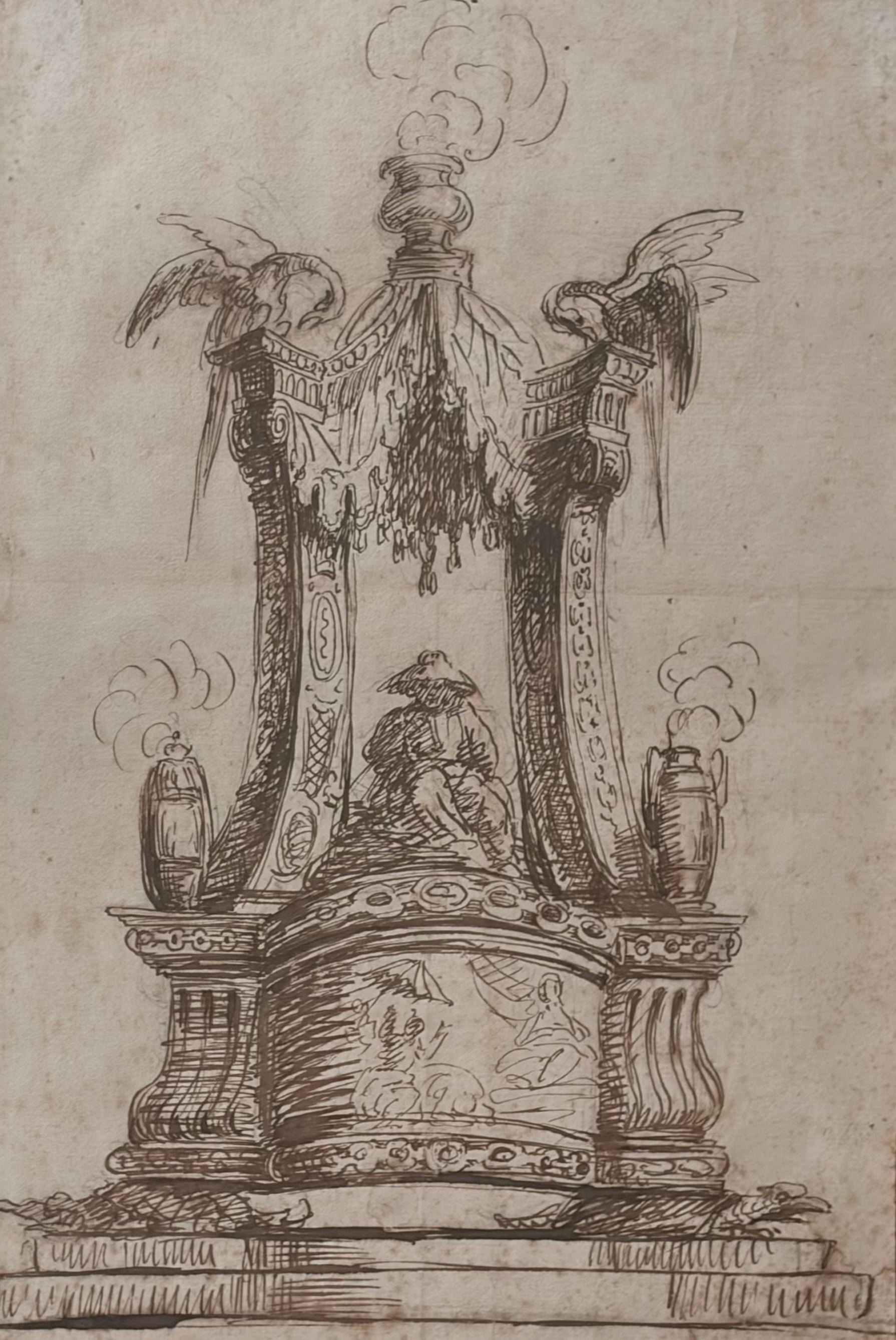 Fabulous brown ink drawing of a fantastical altar, tabernacle, or tomb. Mounted on hand marbled paper and framed in an antique frame.