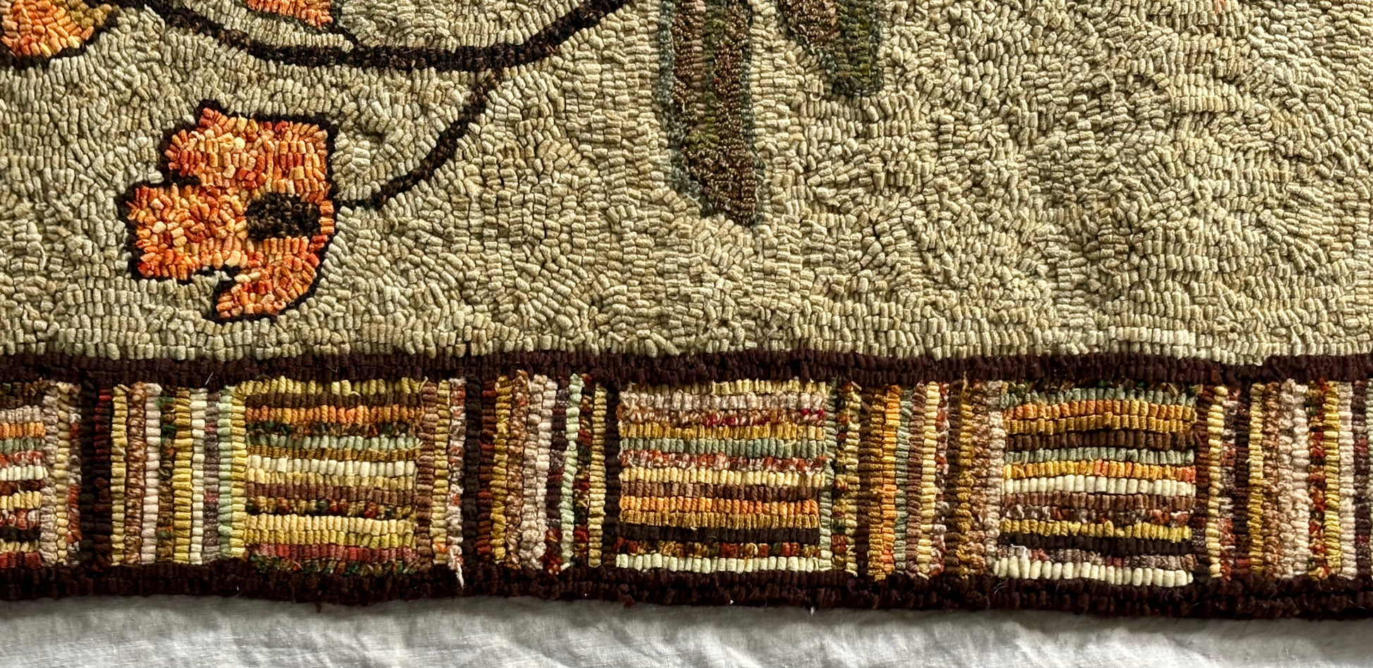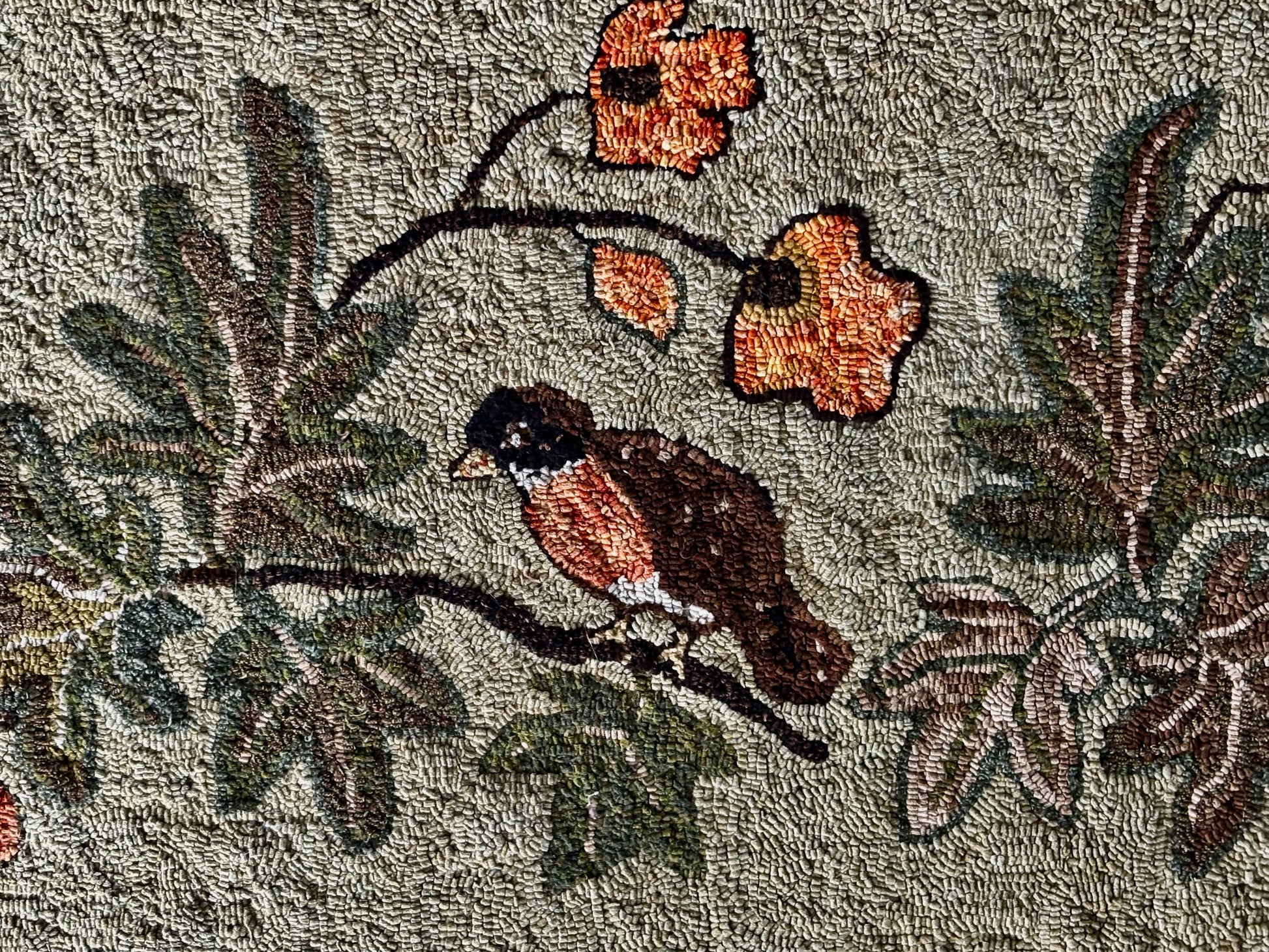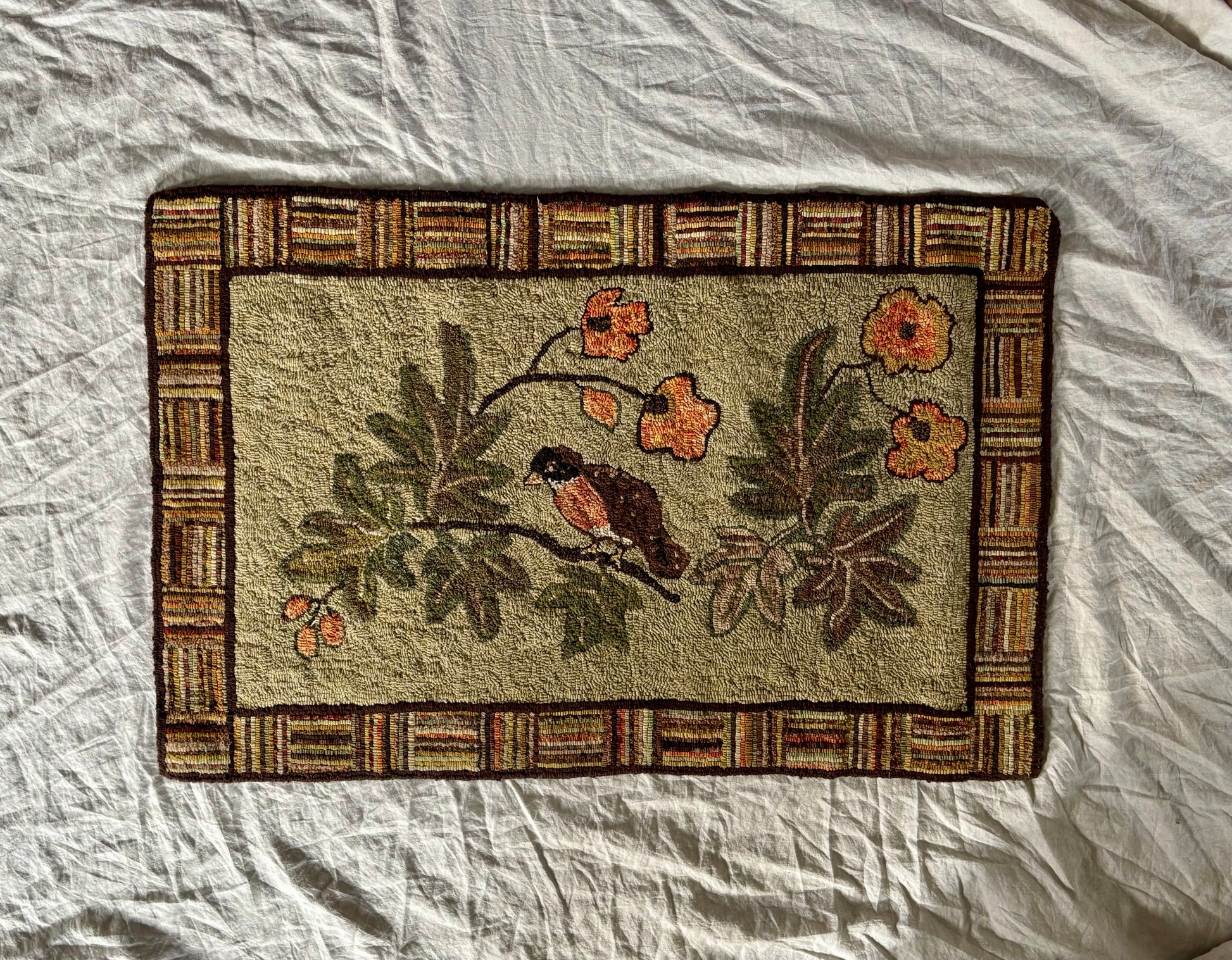 Lovely folk art rug depicting a robin signed on verso by the artist.