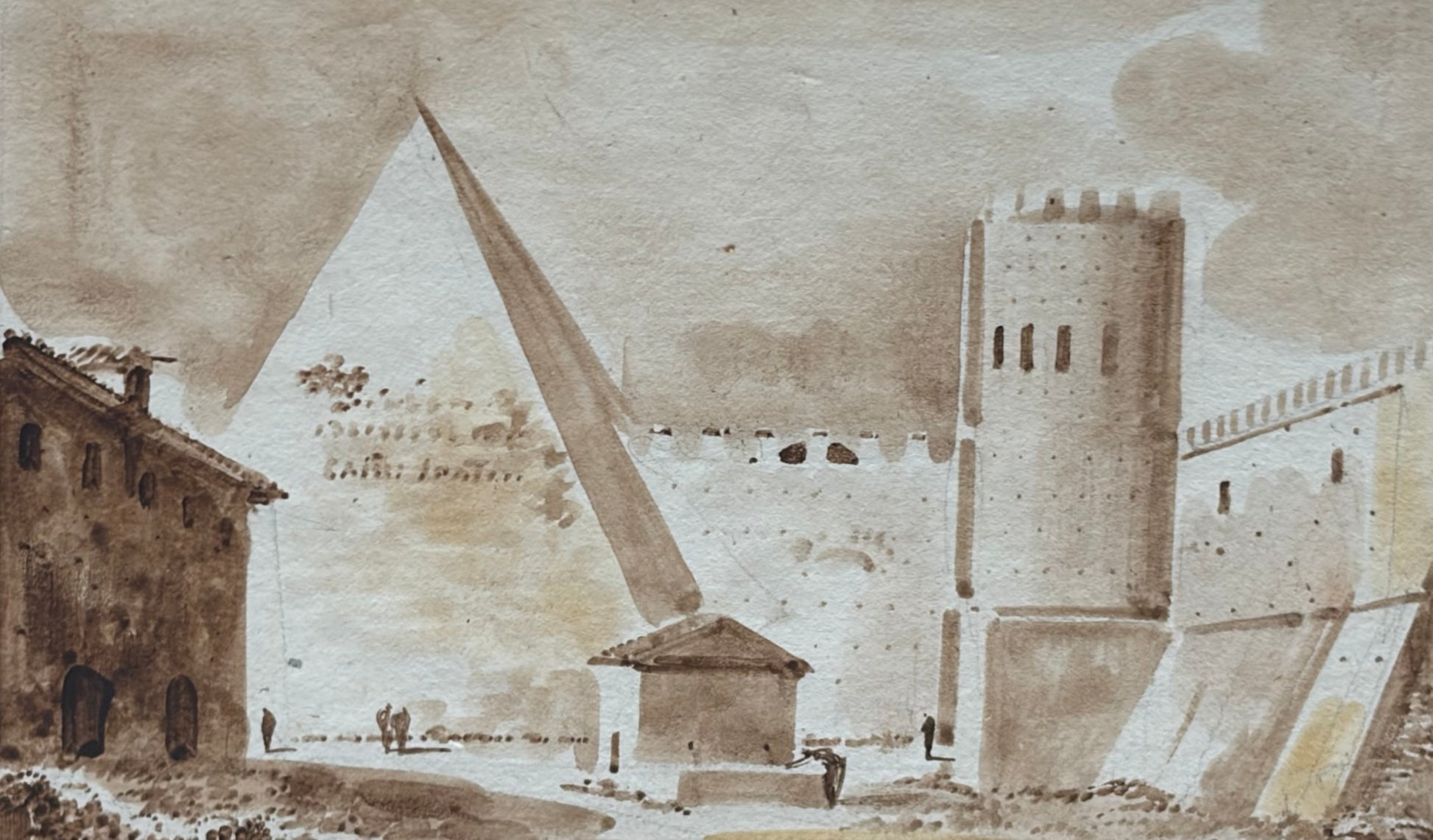 Fabulous 19th century grand tour watercolors, done with the grisaille technique. The watercolors feature: the Temple of Saturn, the Basillica of St. Mary’s, the Aurelian Walls, and the Pyramid of Caius Cestius. In what appears to be their original frames.