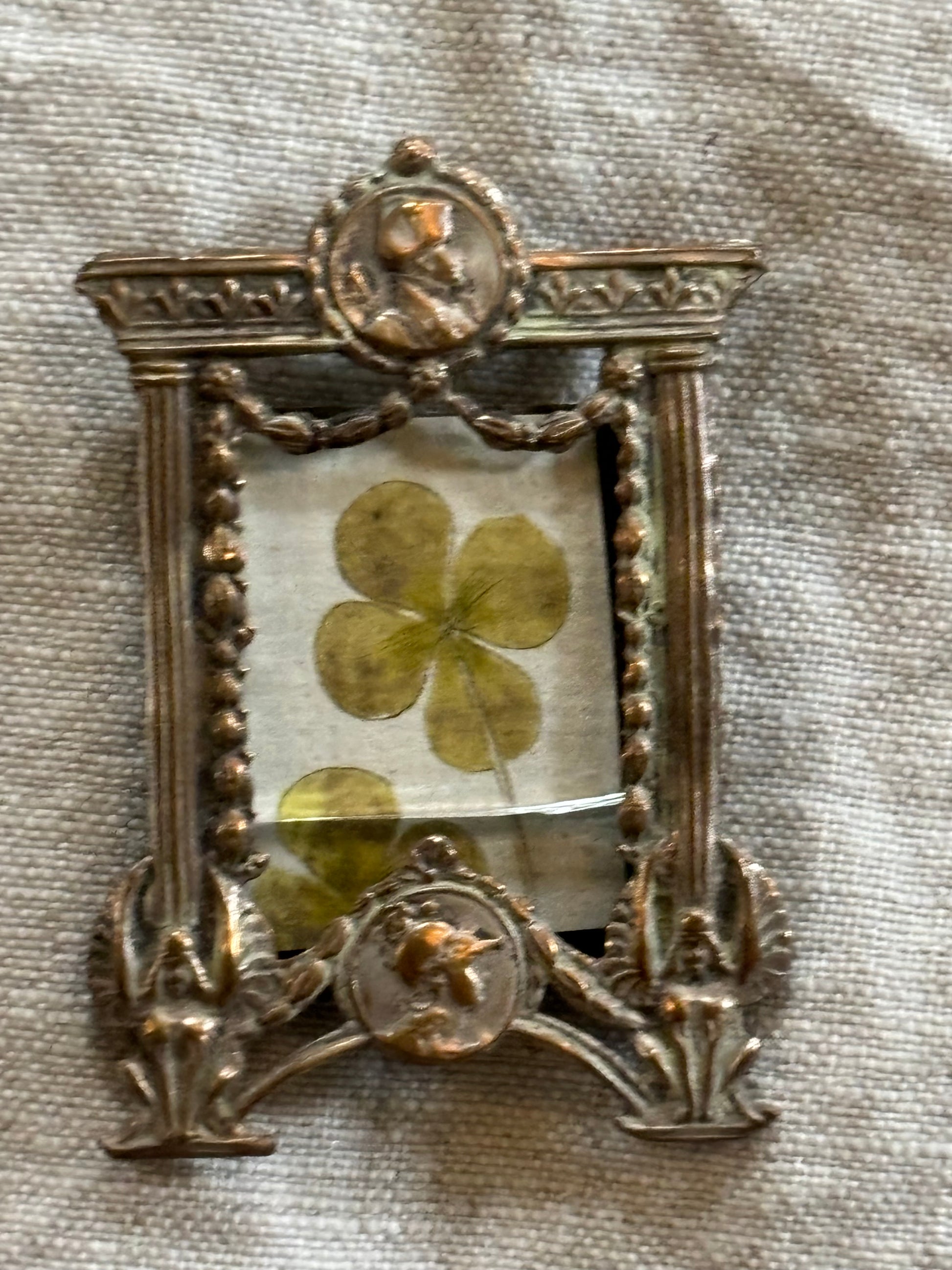 Two available: a miniature brass 19th century French photo frame, featuring architectural decorations of fluted pilasters adorned with garlands and supported by two winged sphinxes. The profile of a helmeted Greek soldier is depicted on the bottom and the Emperor Napoleon I in the top center. The frames were originally silver plated, which is now worn and patinated.