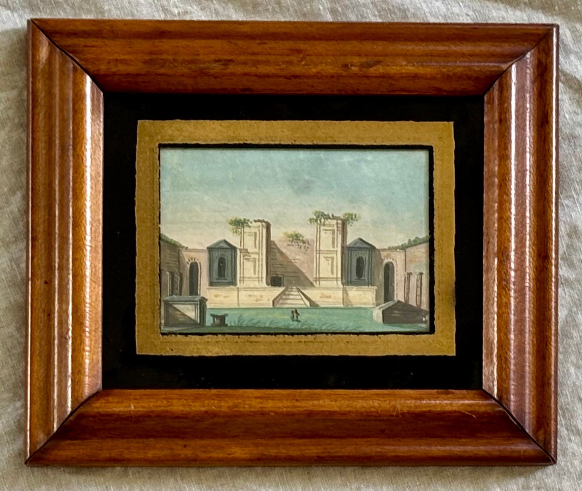 Idealized view of an ancient temple complex amidst the ruins of Pompeii. Two small figures in the foreground enliven the scene. Inscribed on verso: “ A temple among the ruins of Pompeii. Brought by Captn Smith there given aunt Marianne by aunt Fanny.” Newly framed in an antique frame with a reverse painted black mat.